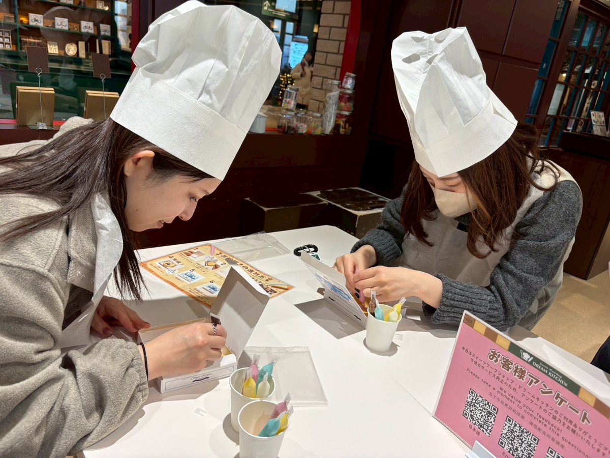 大きなハート形の白い恋人に、チョコペンで自由に絵を描くことが出来ます。