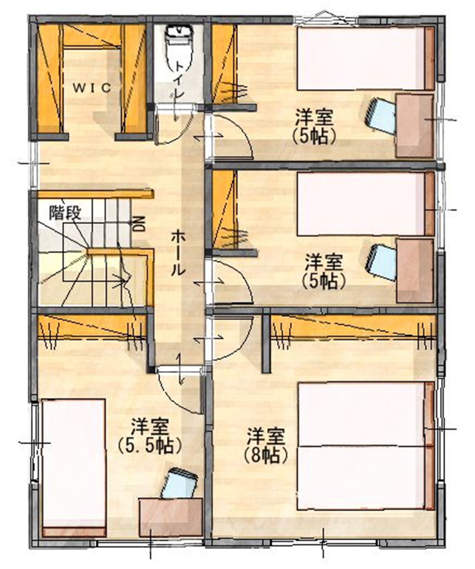 2階はプライベートもしっかり確保 8帖の主寝室には大型のウォークインクローゼット(WIC)を設置。さらに、お子様部屋や趣味に使える個室を3部屋用意した、将来まで安心の4LDKプランです。