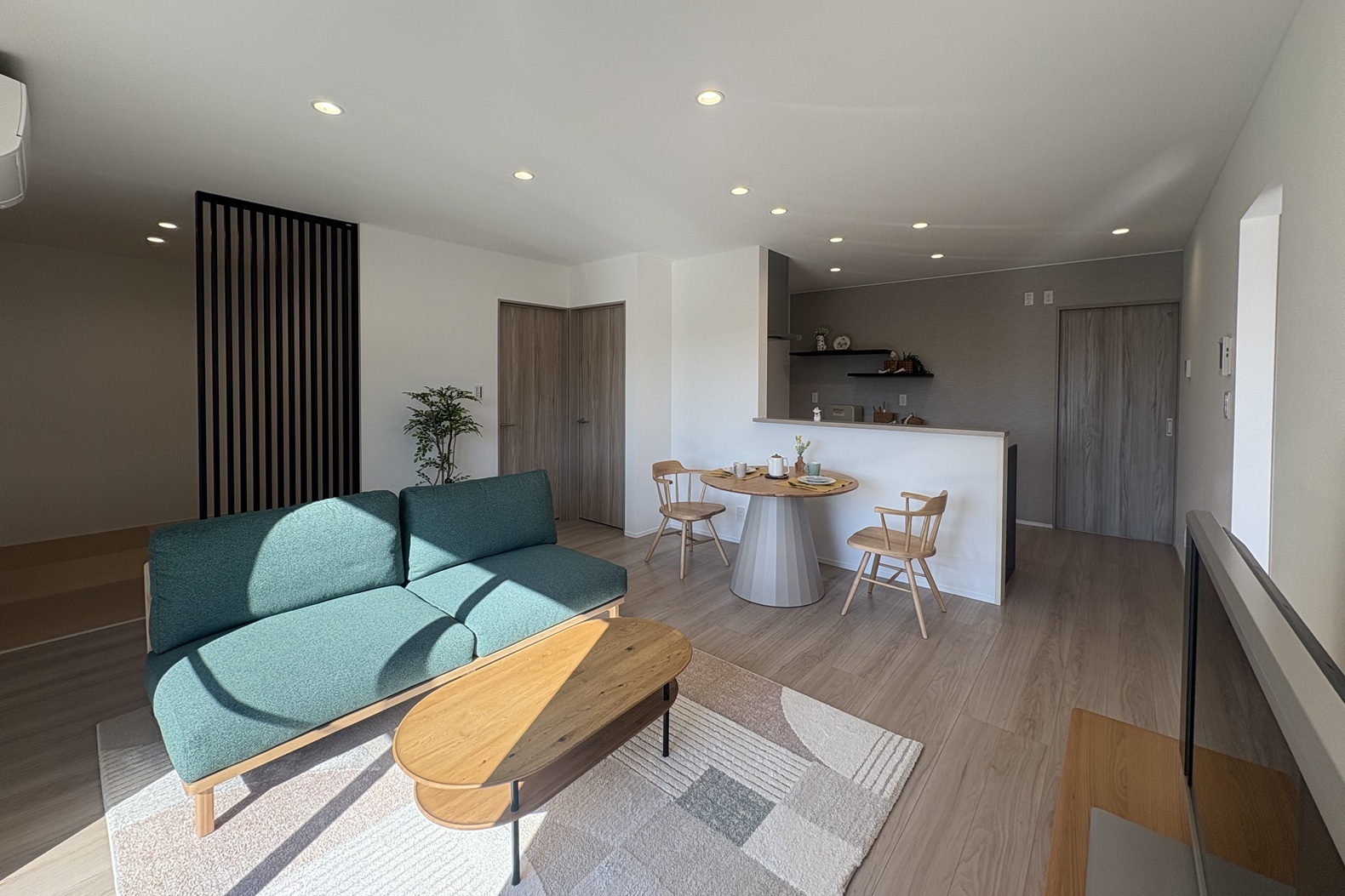 柔らかな色調のフローリングと、アクセントのグリーンが調和する優しい空間です。